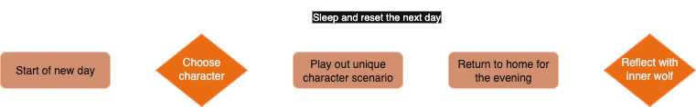 Secondly, in addition to the time the player spends with each character to get to know them, I wanted the player to have time to reflect on that conversation with their “inner wolf”. The choices in Come Home, Wolf don’t have any external changes to the story and are more focused on the player’s internal outlook. This way we could avoid having to build many branching paths while also building our design framework around the goal of having the player focus on the questions of identity the game poses.To facilitate this, we structured the game by days with two main phases: Community Connecting and Reflection. By letting the player choose which character they wanted to interact with, they could move forward character stories incrementally during the Community Connecting phase, then have a related Reflection conversation during their dreams, resetting the loop the next day.
