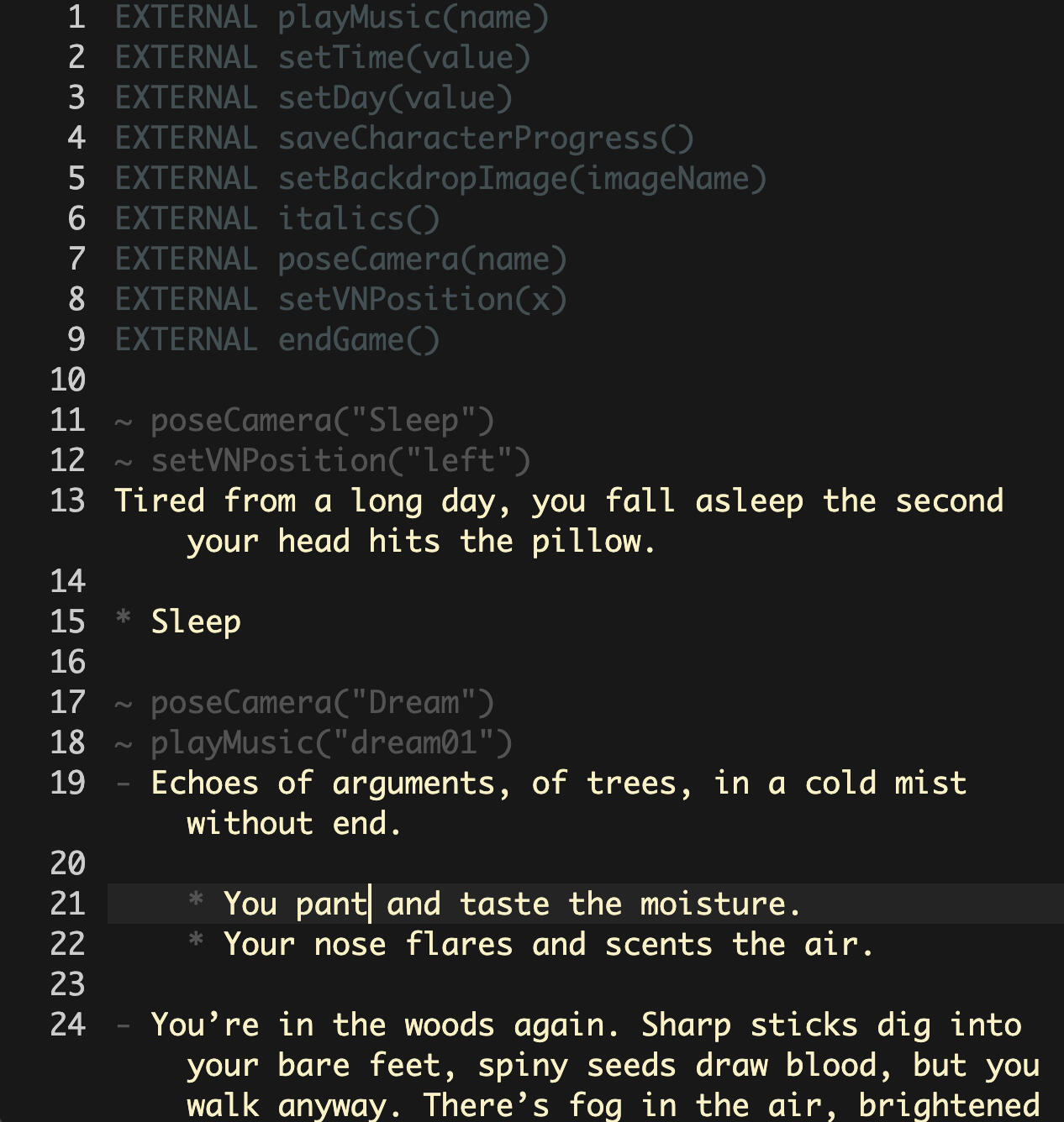 For the narrative elements of the game, I worked closely with our writer Sarah Zedig to build tools she could use to write that would let her playtest the dialogue and control game elements without needing to dig into any code.We ended up using Inky which is an editor which uses the similarly named narrative scripting language 'Ink'. With this, I was able to create hookups between the game engine and the narrative script that Sarah wrote.