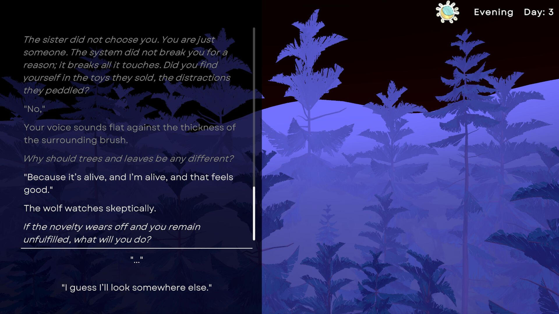 Secondly, in addition to the time the player spends with each character to get to know them, I wanted the player to have time to reflect on that conversation with their “inner wolf”. The choices in Come Home, Wolf don’t have any external changes to the story and are more focused on the player’s internal outlook. This way we could avoid having to build many branching paths while also building our design framework around the goal of having the player focus on the questions of identity the game poses.To facilitate this, we structured the game by days with two main phases: Community Connecting and Reflection. By letting the player choose which character they wanted to interact with, they could move forward character stories incrementally during the Community Connecting phase, then have a related Reflection conversation during their dreams, resetting the loop the next day.