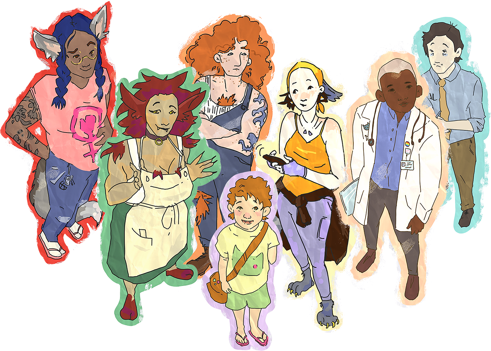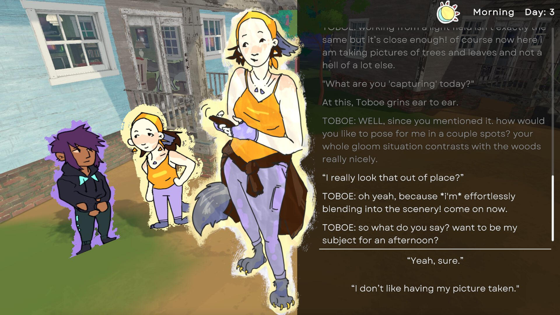 Come Home, Wolf is a small jam project made in collaboration with a team of artists I adore. For a month I managed our team and did all of the game design, programming and logistics for this short, narrative-focused adventure. As part of this jam I wanted to explore topics that mean a lot to me and design a gameplay structure that supports narrative exploration of those elements.In the game you have recently finished your contract working aboard a factory space station and have retired planetside to join a community of people like yourself. Except, you've been taking the company required drug Lygone to suppress your lycanthropy and have no idea what it means to be a werewolf. Each day you spend with a character of your choice to learn what this identity means to them and return home to reflect with the wolf appearing in your dreams.Come Home, Wolf was featured as one of nine games in queer video games exhibit FreePlay! 2024.