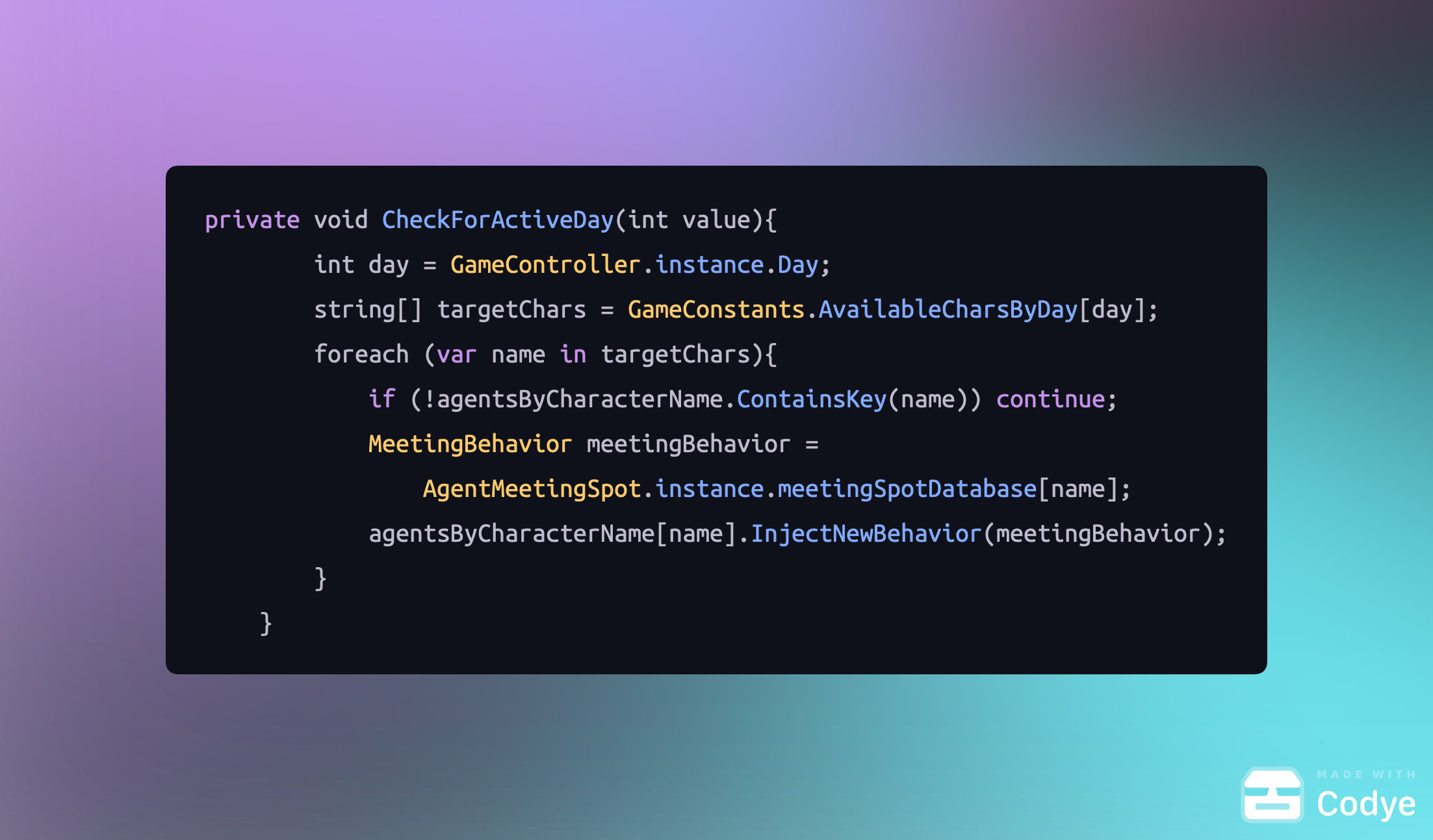 Following the core gameplay loop, each character the player can interact with has a specific dialogue file associated with them by a particular day. In that same regard, I created meeting points where the characters would stand and wait for the player based on their availability on a specific day. When the day is updated, it checks to see if a specific event with a specific character is happening that day and assigns a new behavior based on that check.